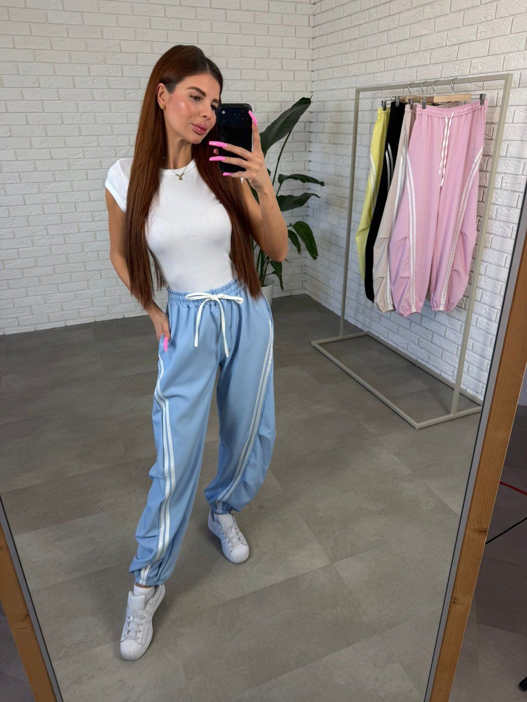 Střih je navržen tak, aby poskytoval dostatek prostoru v oblasti bříška, boků i stehen, díky čemuž kalhoty přirozeně splývají na postavě a nepůsobí obtaženě. Vysoký elastický pas s gumičkou si umíš přizpůsobit dle potřeby.