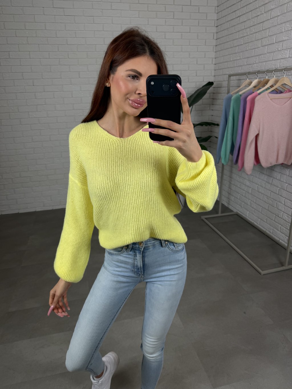 Střih je navržen tak, aby svetřík vzadu sahal těsně pod hýždě, díky čemuž působí velmi lichotivě na postavě. Materiál je maximálně strečový, takže svetřík krásně sedne na konfekční velikosti od XS po XL.