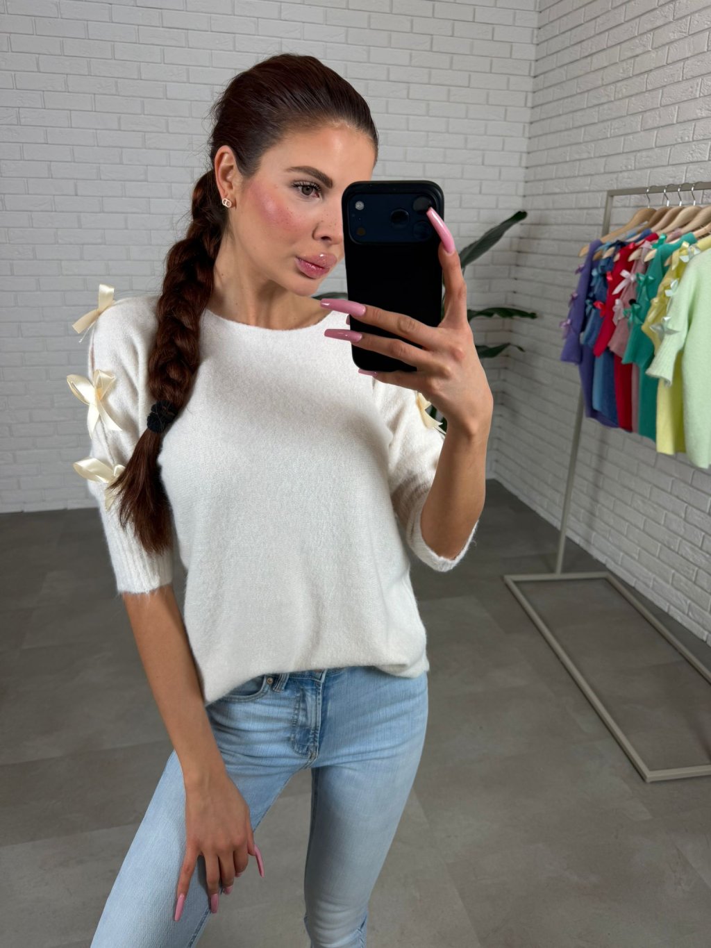 Dominantním prvkem jsou tři saténové mašle na rukávech, které dodávají svetříku romantický a elegantní charakter. Elastické rukávy se pohodlně přizpůsobí a drží tvar, přičemž vytváří jemný a upravený vzhled. Svetřík se jednoduše kombinuje s kalhotami, sukní i džíny a je ideální pro běžné dny i elegantnější příležitosti. Díky vysoké elasticitě materiálu sedne na konfekční velikosti od XS po XL.