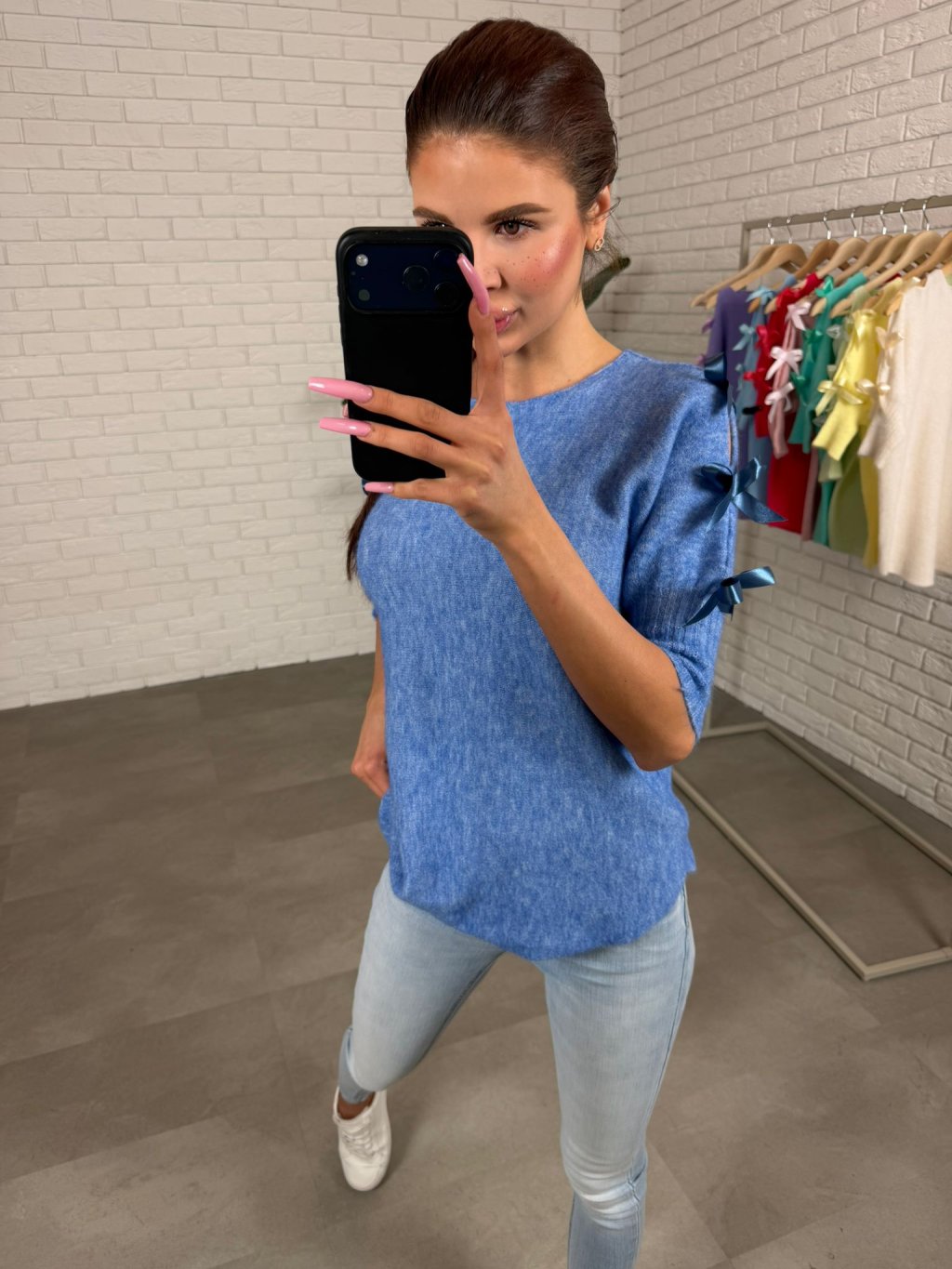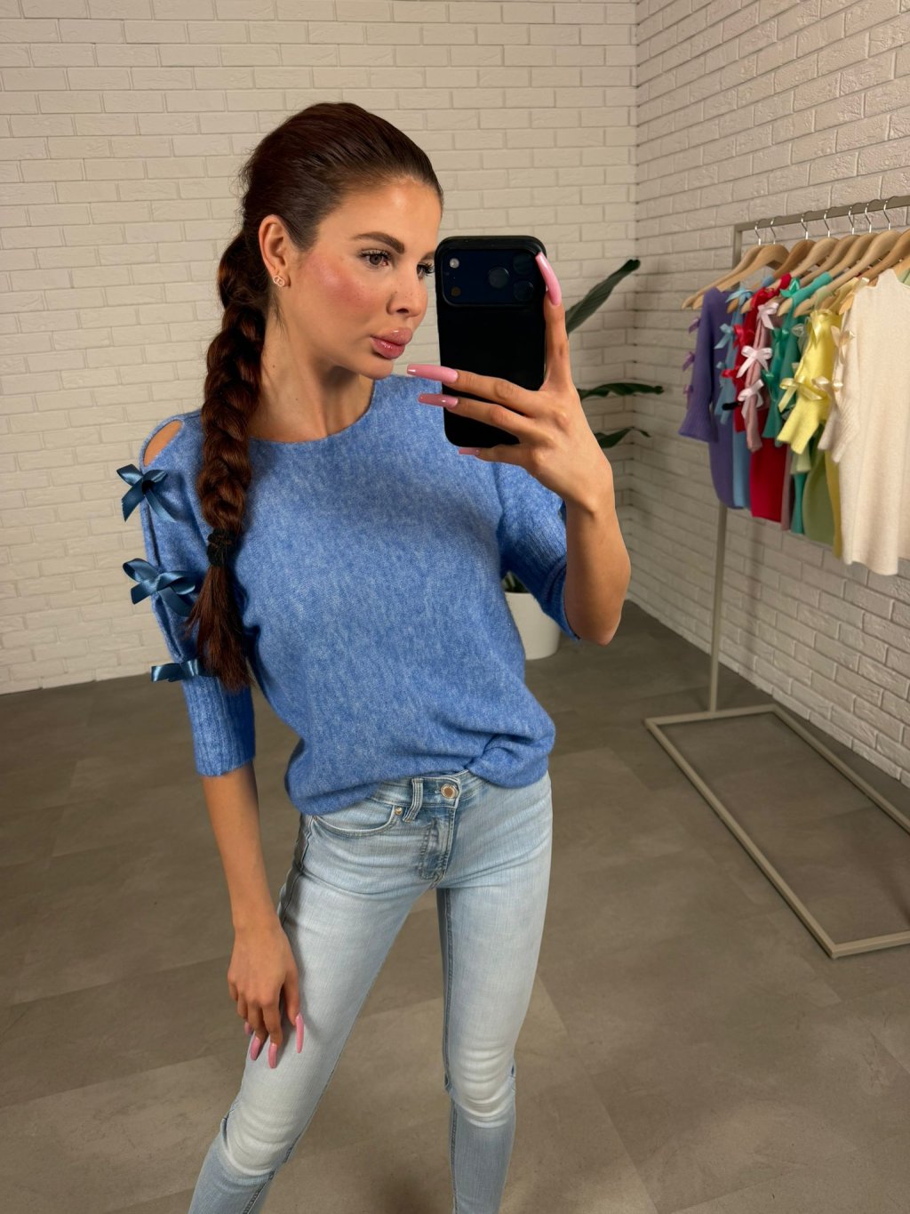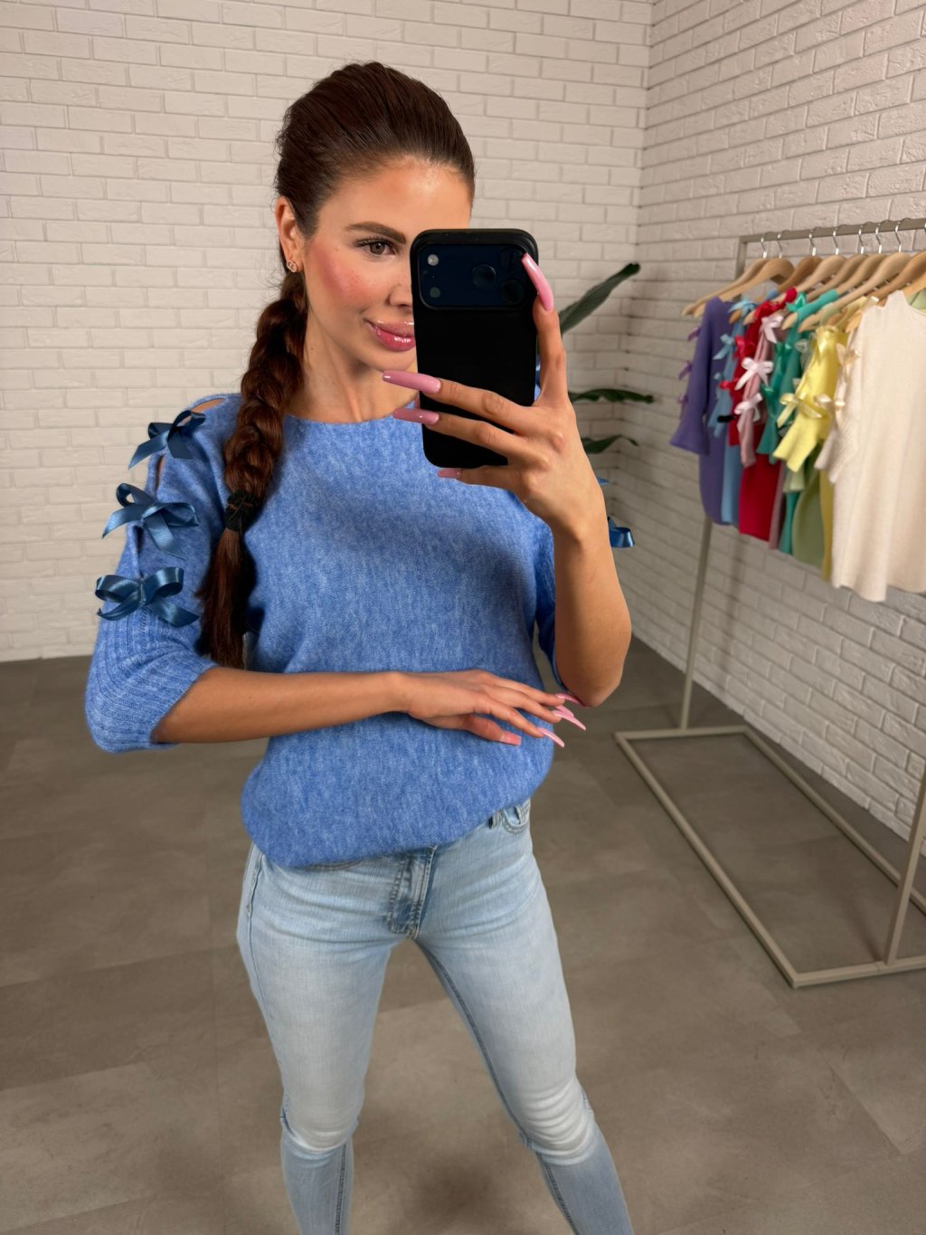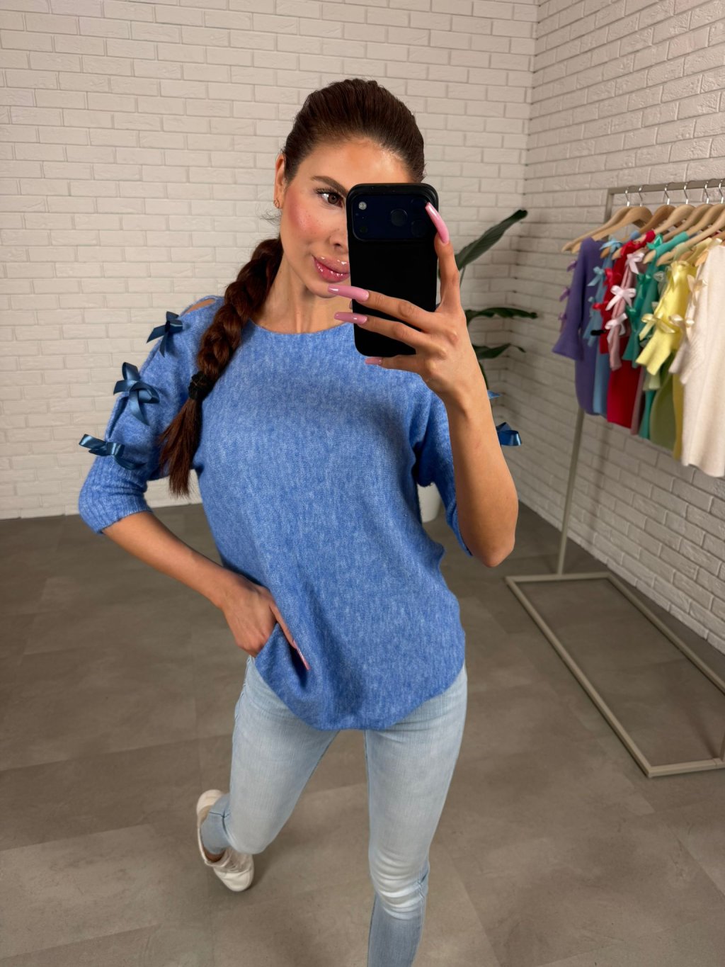 Dominantním prvkem jsou tři saténové mašle na rukávech, které dodávají svetříku romantický a elegantní charakter. Elastické rukávy se pohodlně přizpůsobí a drží tvar, přičemž vytváří jemný a upravený vzhled. Svetřík se jednoduše kombinuje s kalhotami, sukní i džíny a je ideální pro běžné dny i elegantnější příležitosti. Díky vysoké elasticitě materiálu sedne na konfekční velikosti od XS po XL.