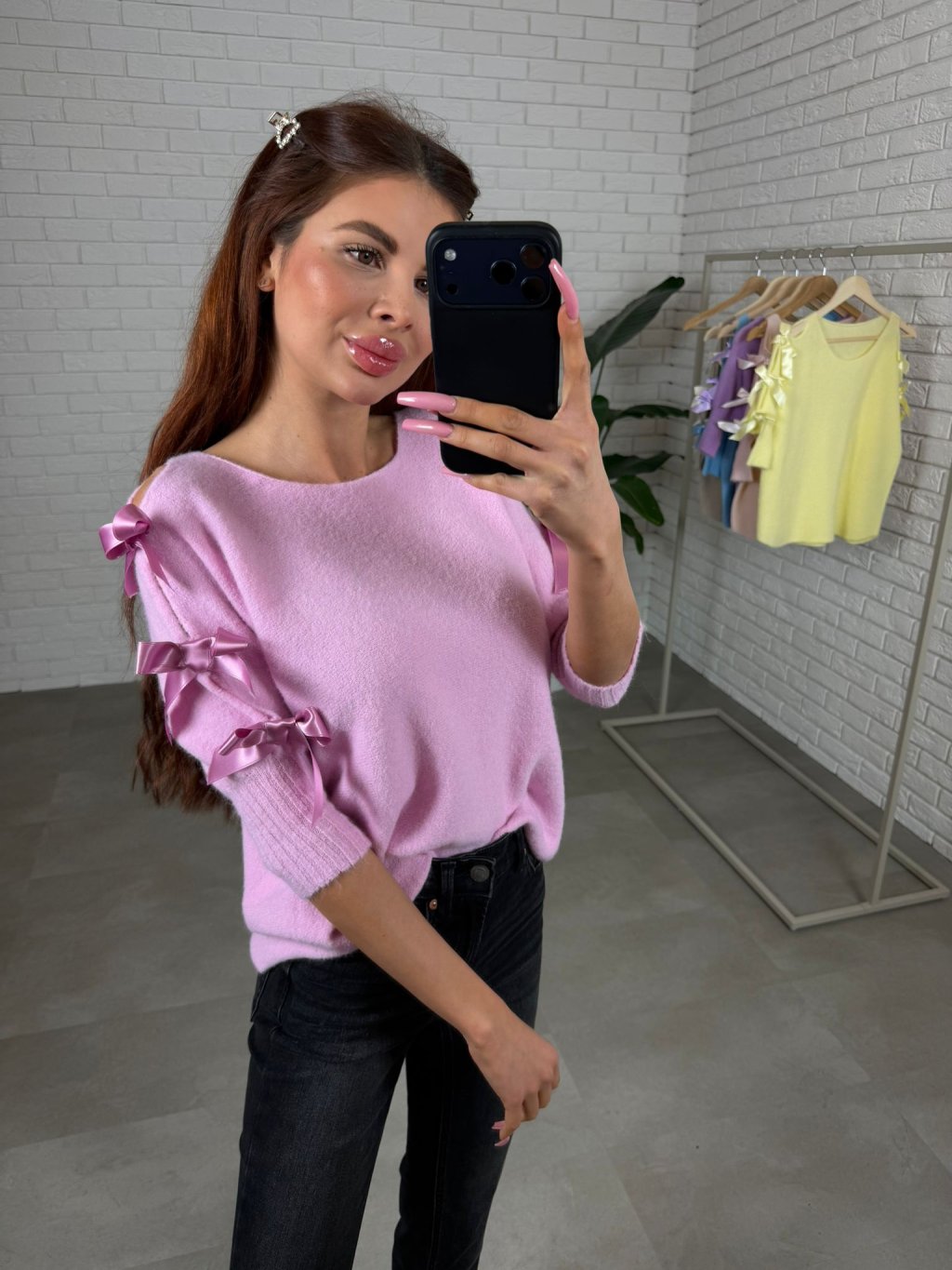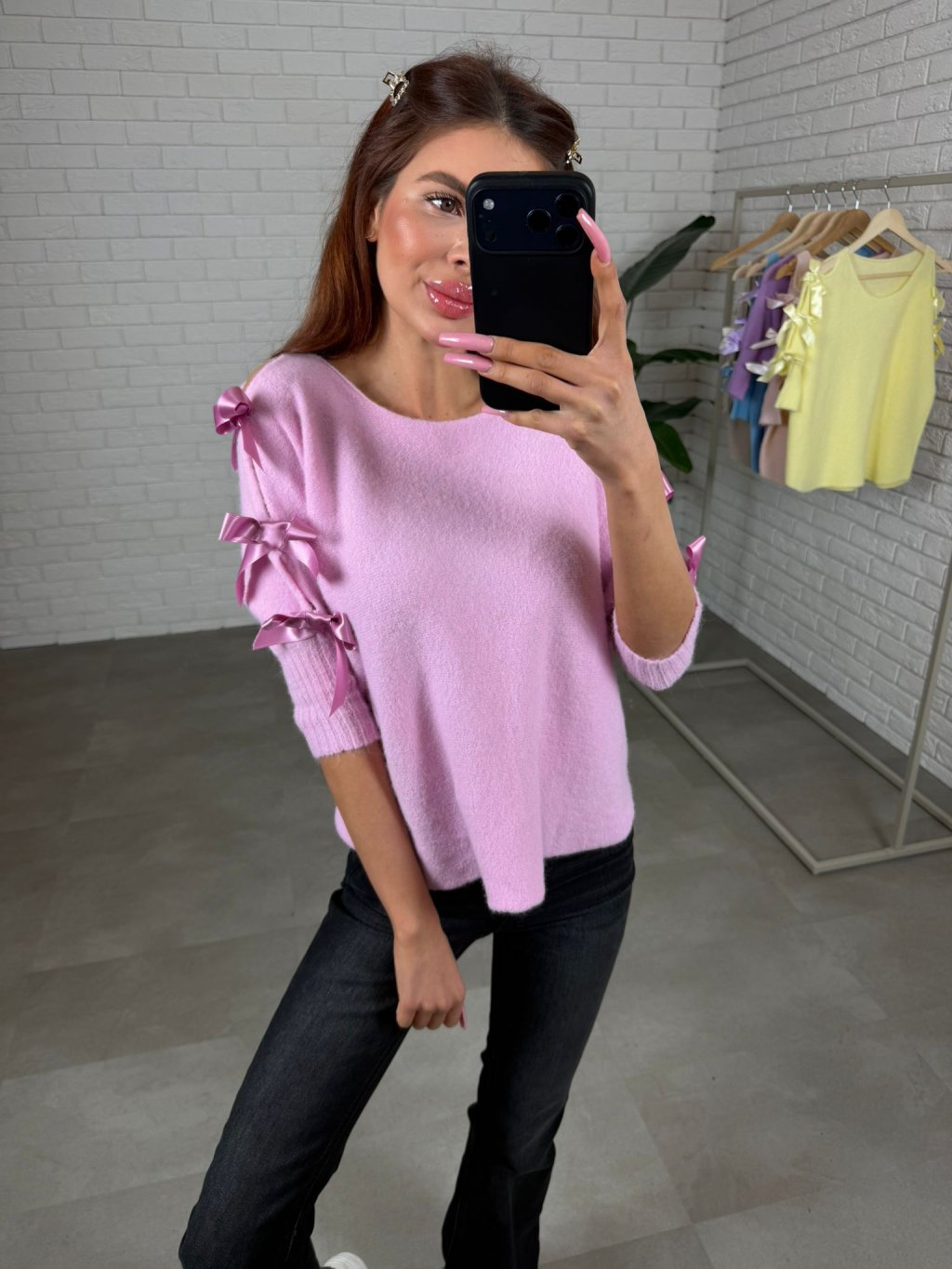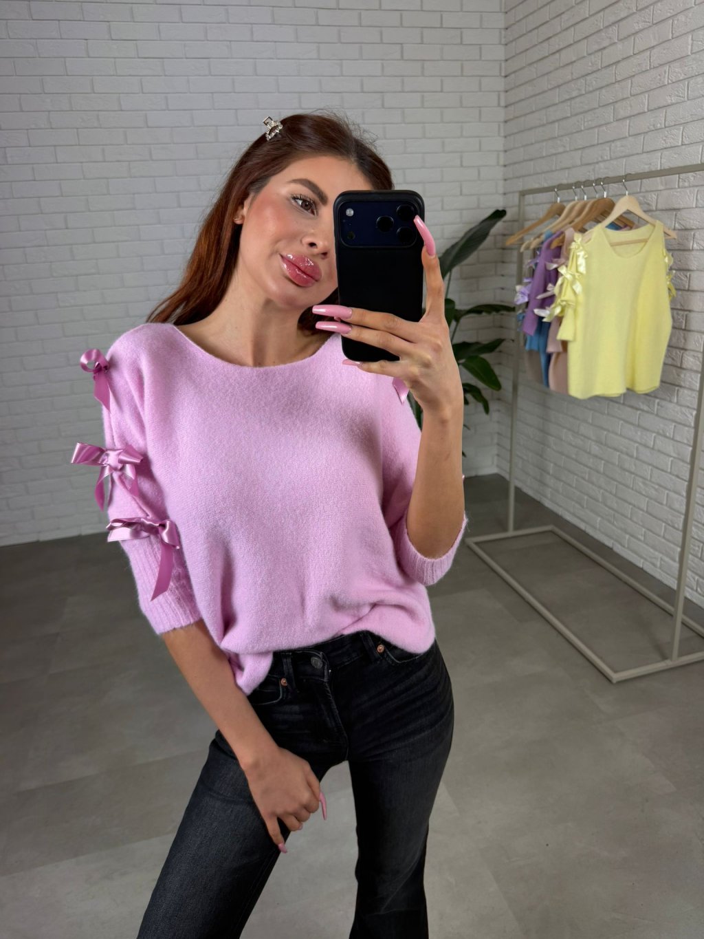 Dominantním prvkem jsou tři saténové mašle na rukávech, které dodávají svetříku romantický a elegantní charakter. Elastické rukávy se pohodlně přizpůsobí a drží tvar, přičemž vytváří jemný a upravený vzhled. Svetřík se jednoduše kombinuje s kalhotami, sukní i džíny a je ideální pro běžné dny i elegantnější příležitosti. Díky vysoké elasticitě materiálu sedne na konfekční velikosti od XS po XL.