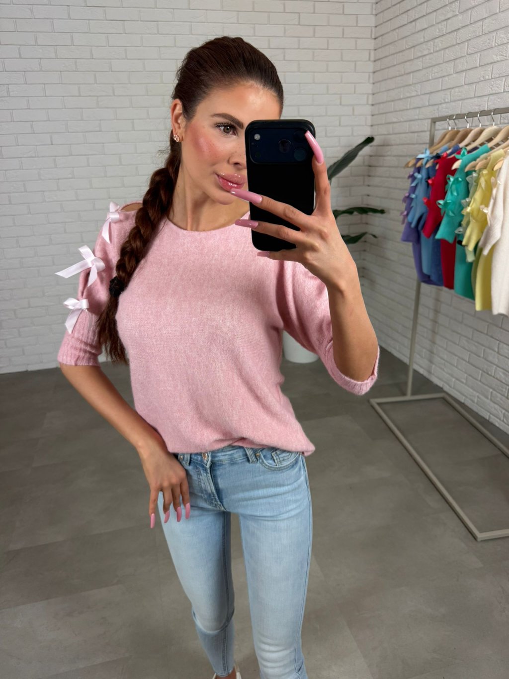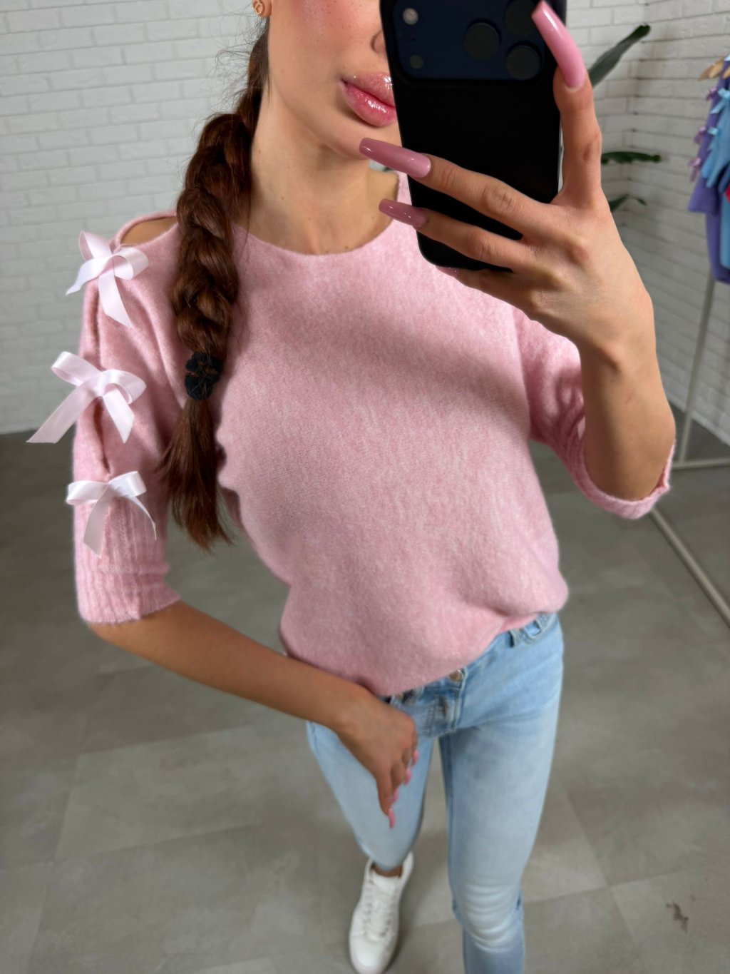 Dominantním prvkem jsou tři saténové mašle na rukávech, které dodávají svetříku romantický a elegantní charakter. Elastické rukávy se pohodlně přizpůsobí a drží tvar, přičemž vytváří jemný a upravený vzhled. Svetřík se jednoduše kombinuje s kalhotami, sukní i džíny a je ideální pro běžné dny i elegantnější příležitosti. Díky vysoké elasticitě materiálu sedne na konfekční velikosti od XS po XL.