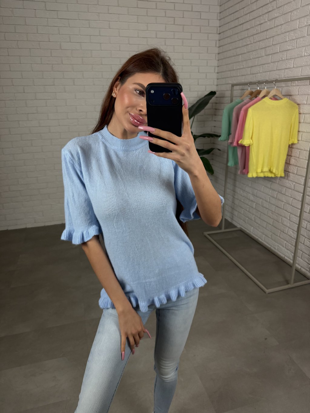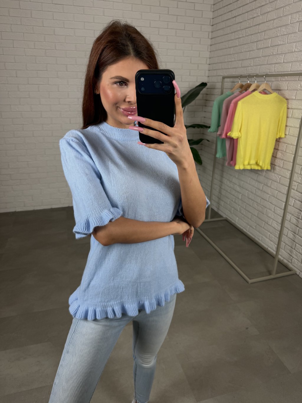 Dominantním detailem jsou rozkošné volánky na spodní části svetříku a na rukávech, které dodávají modelu romantický a hravý nádech. Rukávy mají délku po lokty, díky čemuž svetřík působí lehce a velmi žensky.