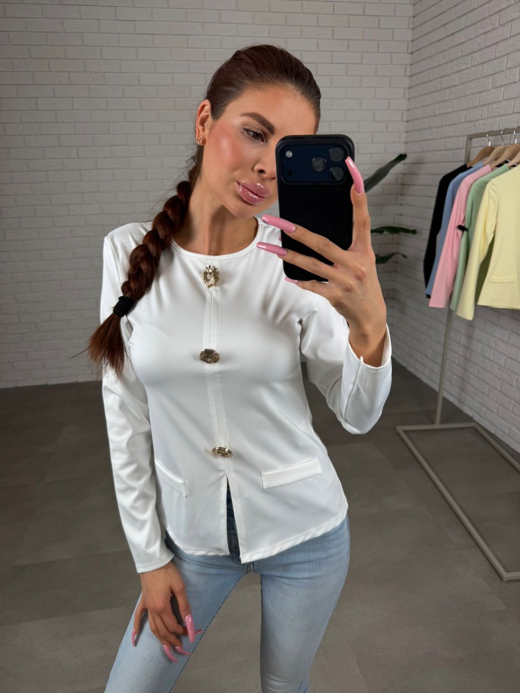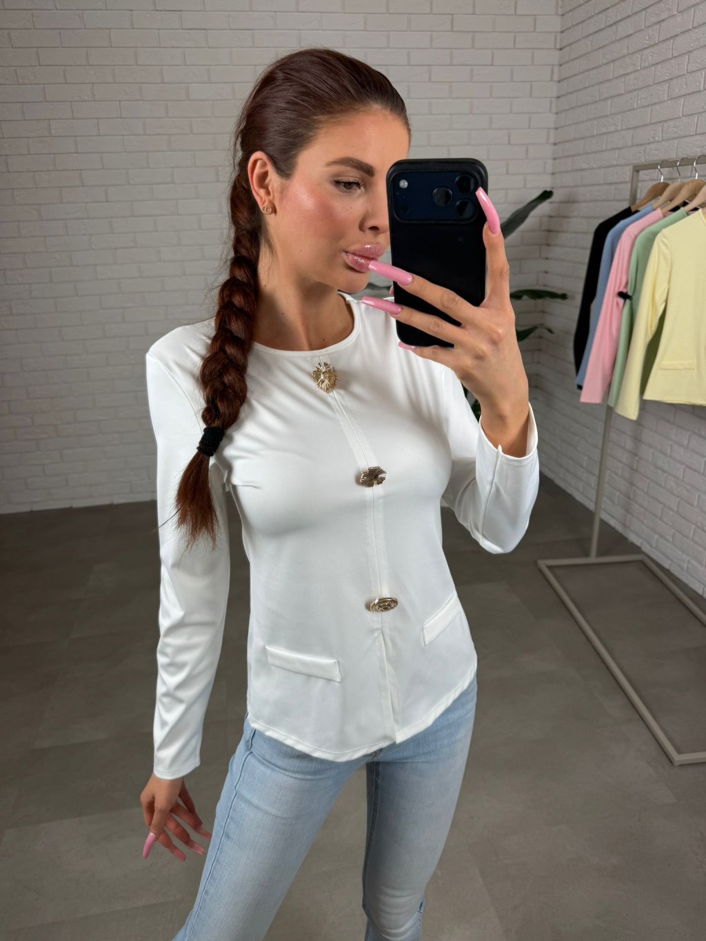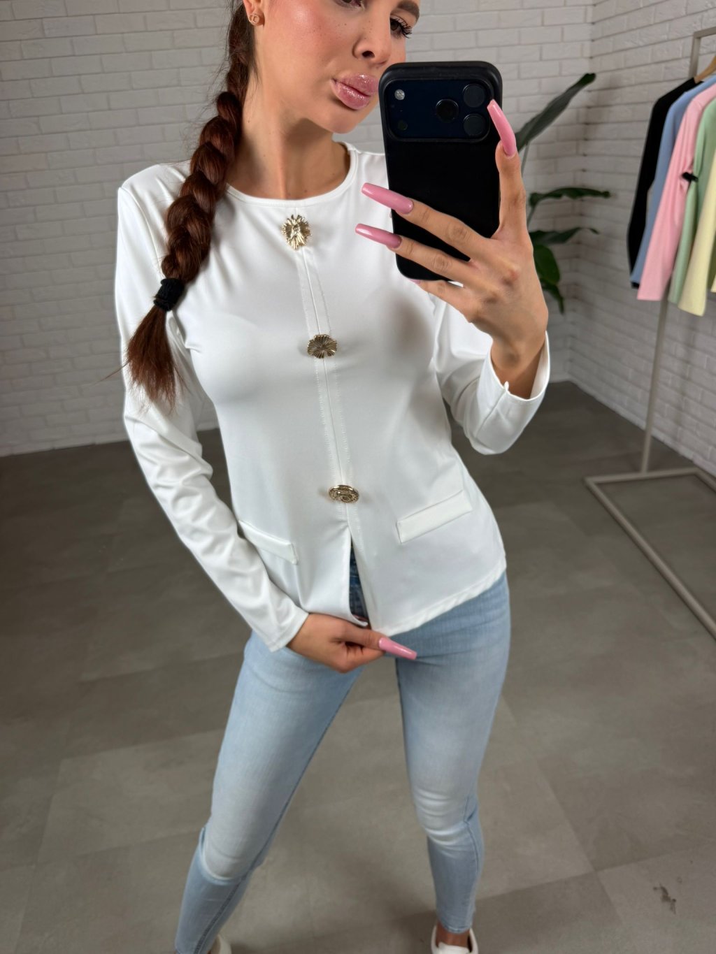 Aby top nepůsobil příliš jednoduše, doplňují ho tři zlaté mušličkové ozdoby, které mu dodávají jemný, sofistikovaný detail. Rukávy jsou dlouhé, s krátkým rozparkem na konci, který působí velmi vkusně. Přední část je doplněna o jemné „falešné“ kapsy, které dotvářejí celkový elegantní vzhled. Střih je mírně užší, proto jej doporučujeme pro velikosti XS až M.