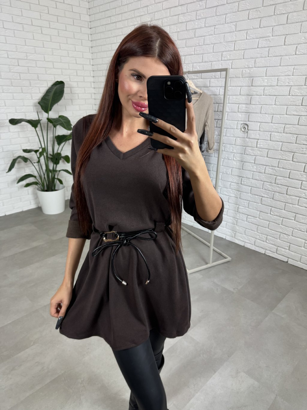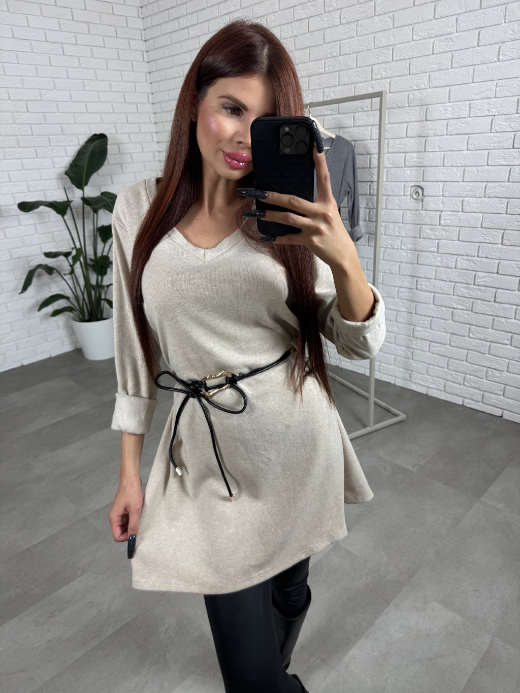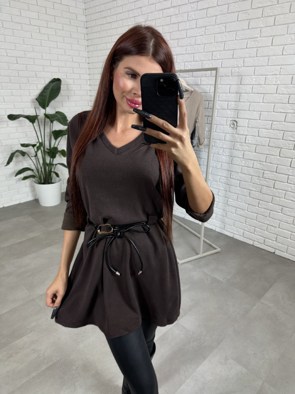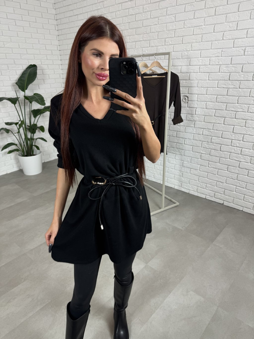 Svetříková tunika DANIELA je ušita z velmi měkoučkého a příjemného materiálu. Má prodloužený střih a díky opasku s originální zlatou aplikací z koženkového materiálu pěkně zvýrazní pas. Má sehnuté rukávy a decentní véčkový výstřih, což jí dodává ležérní, ale stále stylový vzhled. Vhodná je pro kombinování, s legínami nebo kalhotami. Sedne na konfekční velikosti od XS po L.
