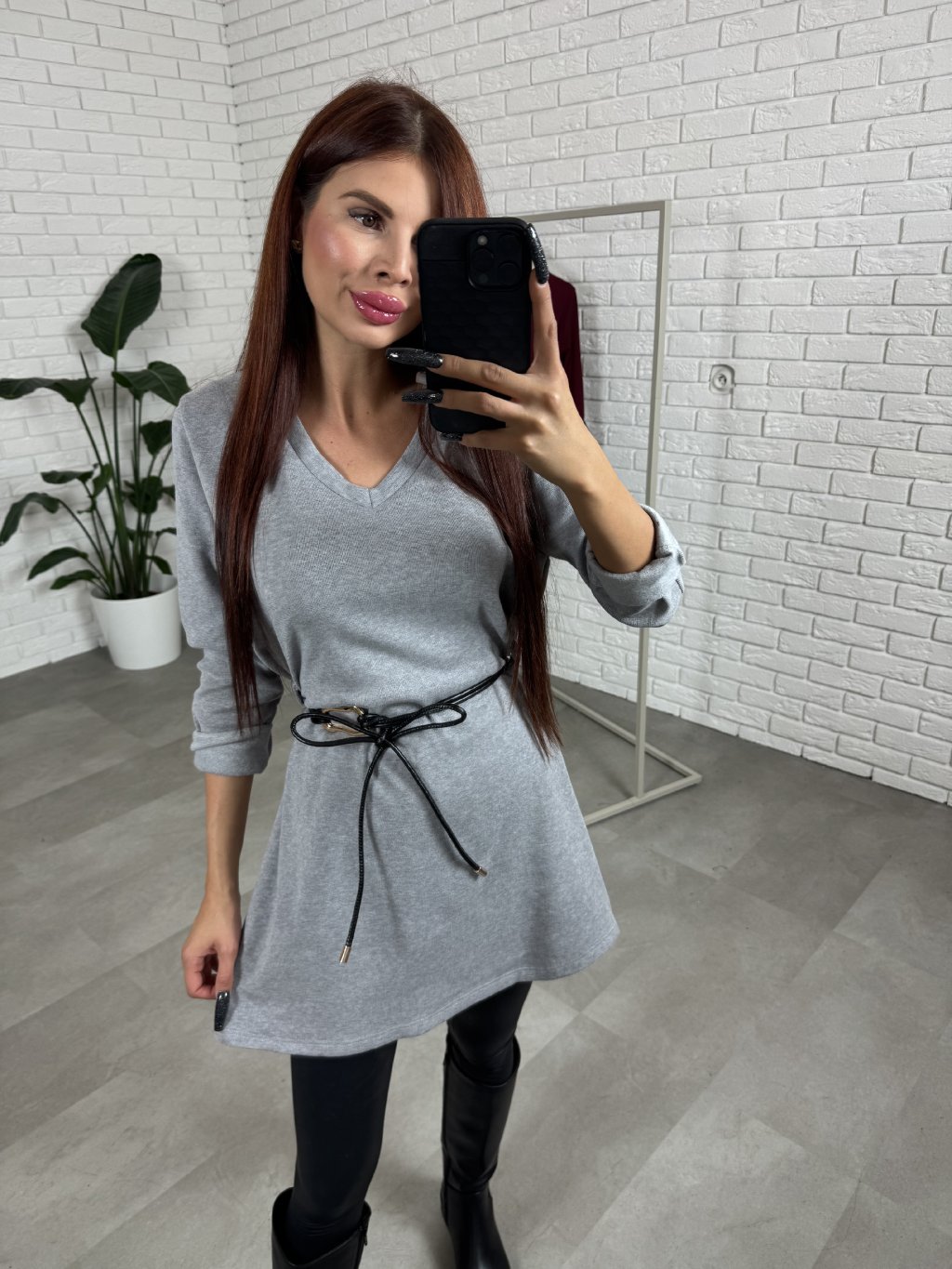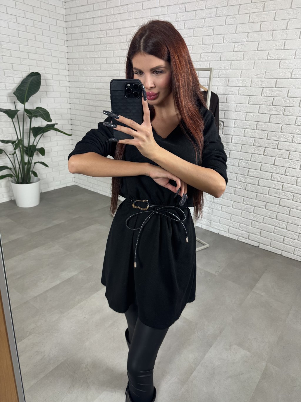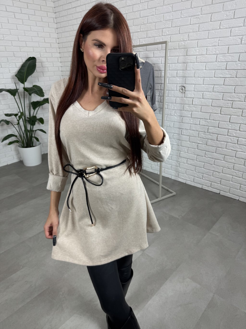 Svetříková tunika DANIELA je ušita z velmi měkoučkého a příjemného materiálu. Má prodloužený střih a díky opasku s originální zlatou aplikací z koženkového materiálu pěkně zvýrazní pas. Má sehnuté rukávy a decentní véčkový výstřih, což jí dodává ležérní, ale stále stylový vzhled. Vhodná je pro kombinování, s legínami nebo kalhotami. Sedne na konfekční velikosti od XS po L.