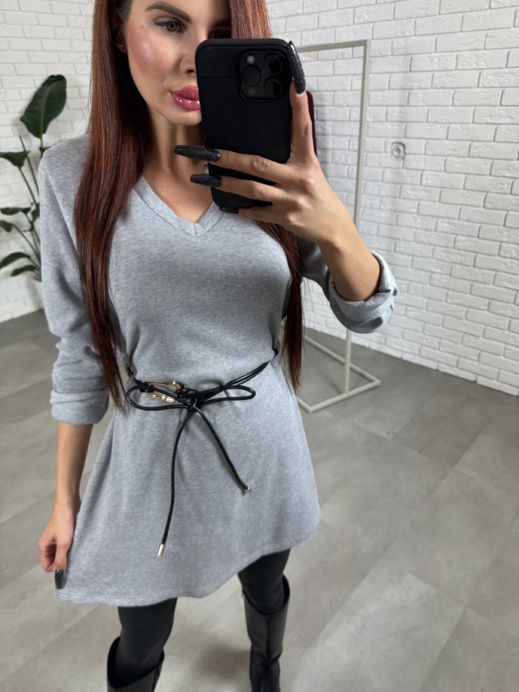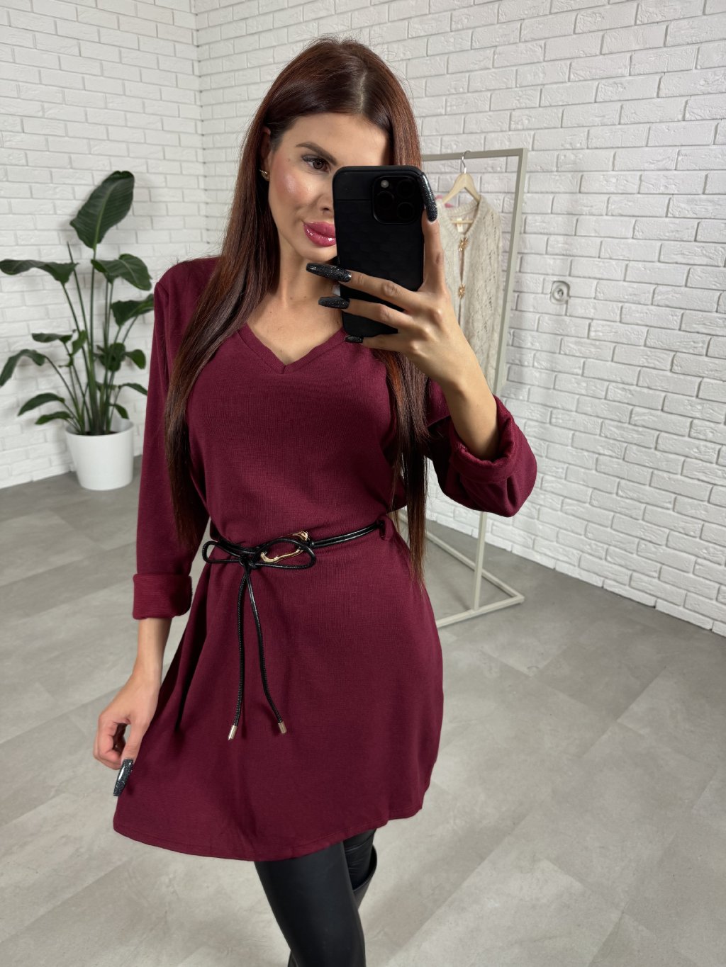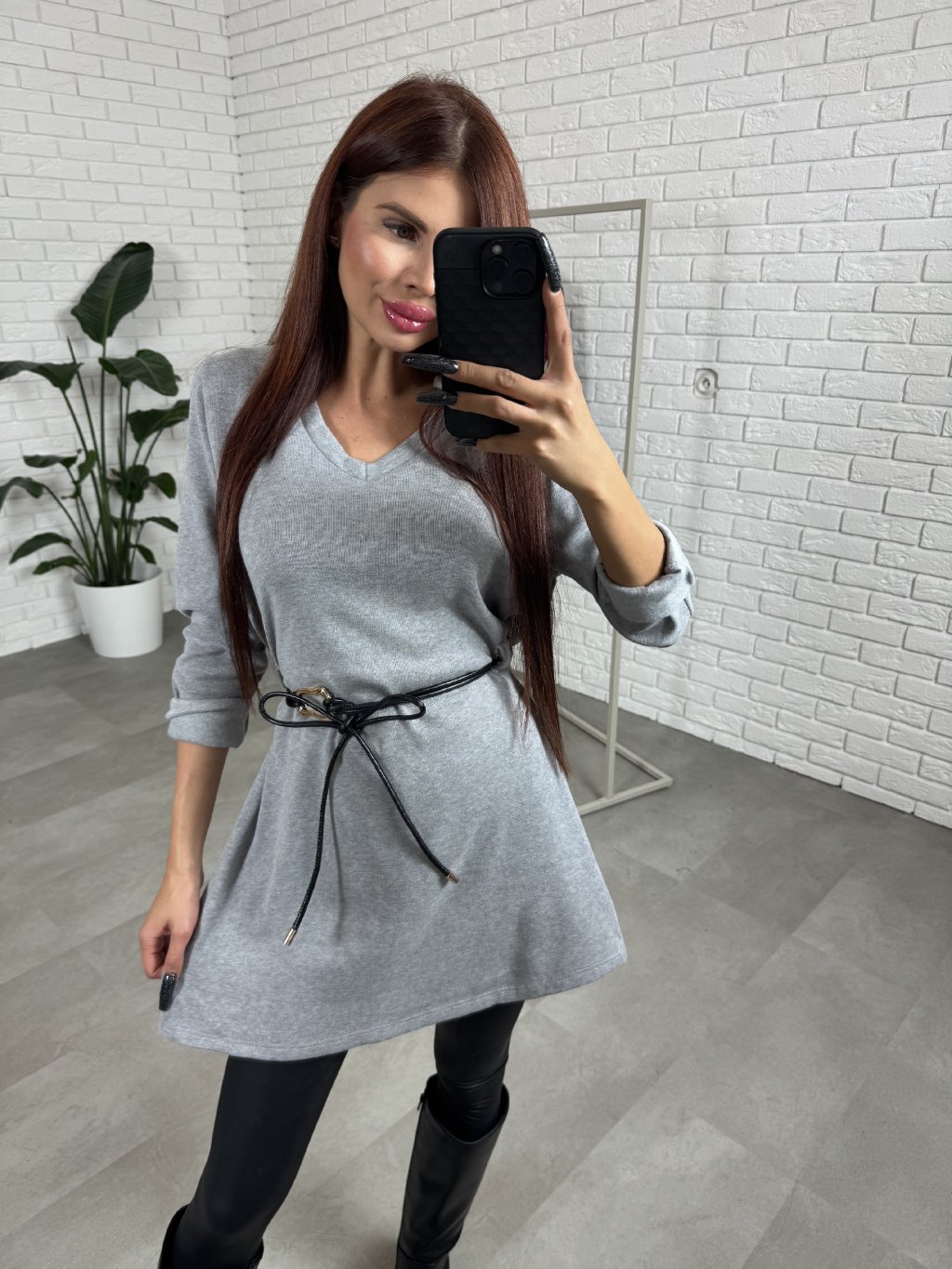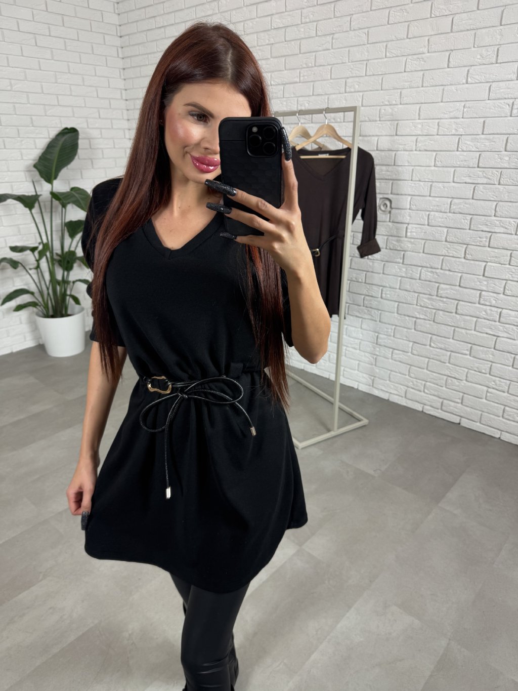 Svetříková tunika DANIELA je ušita z velmi měkoučkého a příjemného materiálu. Má prodloužený střih a díky opasku s originální zlatou aplikací z koženkového materiálu pěkně zvýrazní pas. Má sehnuté rukávy a decentní véčkový výstřih, což jí dodává ležérní, ale stále stylový vzhled. Vhodná je pro kombinování, s legínami nebo kalhotami. Sedne na konfekční velikosti od XS po L.