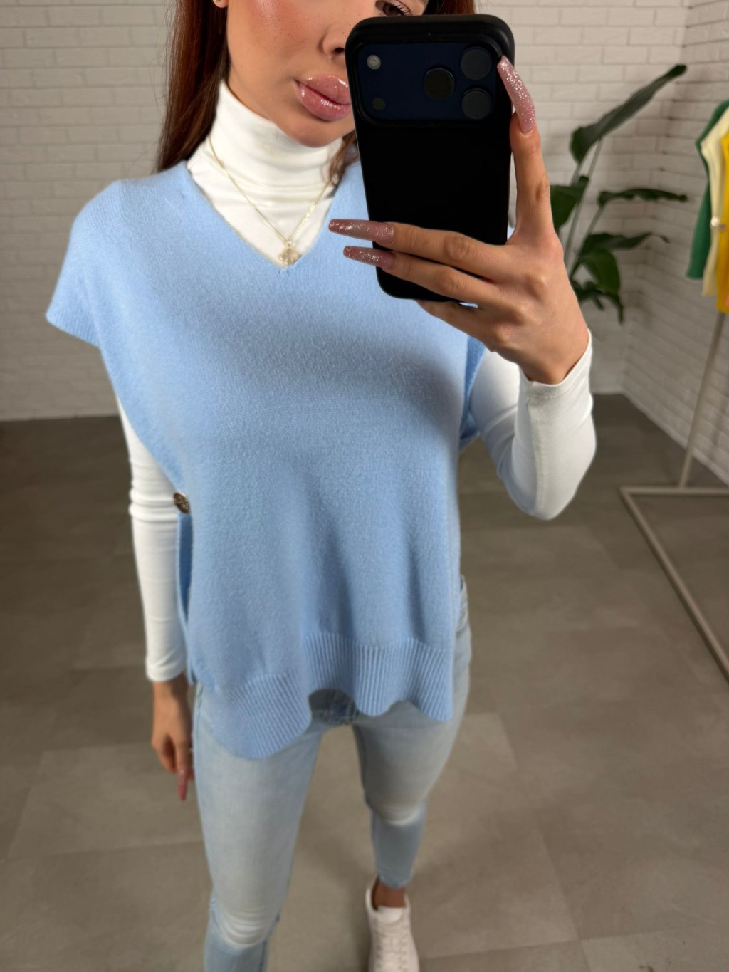 Úpletová vesta PALLA je ušitá z jemného a měkkého materiálu, který je velmi příjemný na dotek a pohodlný po celý den. Úplet působí lehce, ale zároveň drží tvar a vytváří upravený, elegantní vzhled bez zbytečného objemu. Volnější střih krásně splývá na postavě, neobepíná problematické partie a přirozeně zakryje oblast bříška. Díky výstřihu do V působí žensky a lichotivě, opticky prodlužuje krk a skvěle se kombinuje s rolákem, košilí i jednoduchým tričkem. Kratší rukáv dodává vestě moderní nádech a dělá z ní ideální kousek na vrstvení během chladnějších dnů. Boční detail s knoflíkem je nenápadným, ale stylovým prvkem, který vestu odlišuje a dodává jí originalitu. Úpletová vesta PALLA je skvělou volbou k džínům, elegantním kalhotám i sukni – jednoduše ji sladíš do ležérního i uhlazenějšího outfitu. Sedí na konfekční velikosti XS až XL a díky svému univerzálnímu střihu se přizpůsobí různým typům postavy.